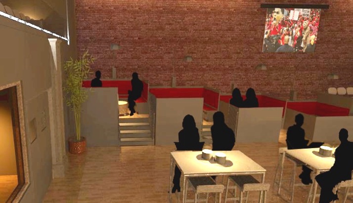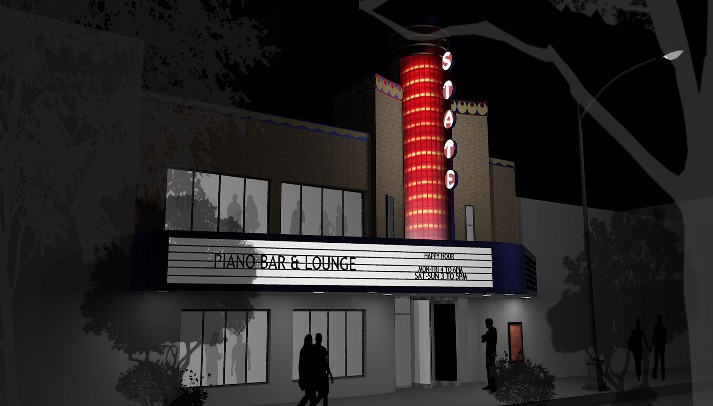 Each architecture student was assigned one of three theaters in the district, and each landscape architecture student was responsible for the street scape in the theater district. I choose to work on the State Theater. Although a common name, this State Theatre, was opened in 1936 and featured some uncommon and unique, colorful signage. Its centerpiece was a huge circular column that was covered in glass brick on the front and was trimmed in red and blue on its top. Attached to and protruding from the column was a vertical support that had State spelled out in individual white letters on red circular backgrounds. The theater is still open today, but instead of movies, features musical acts.