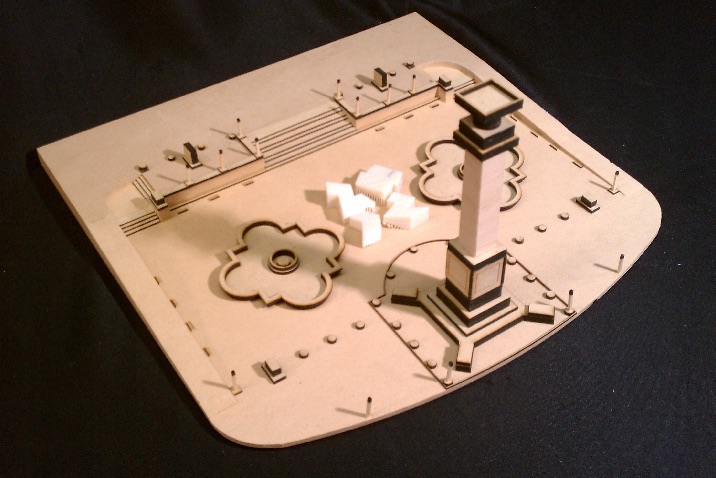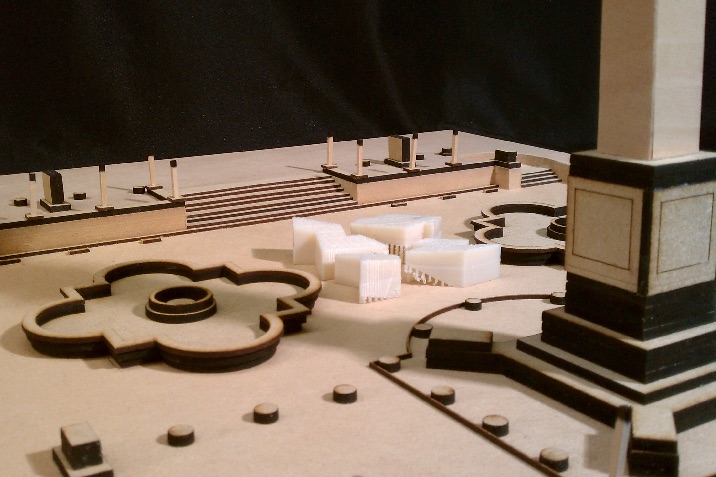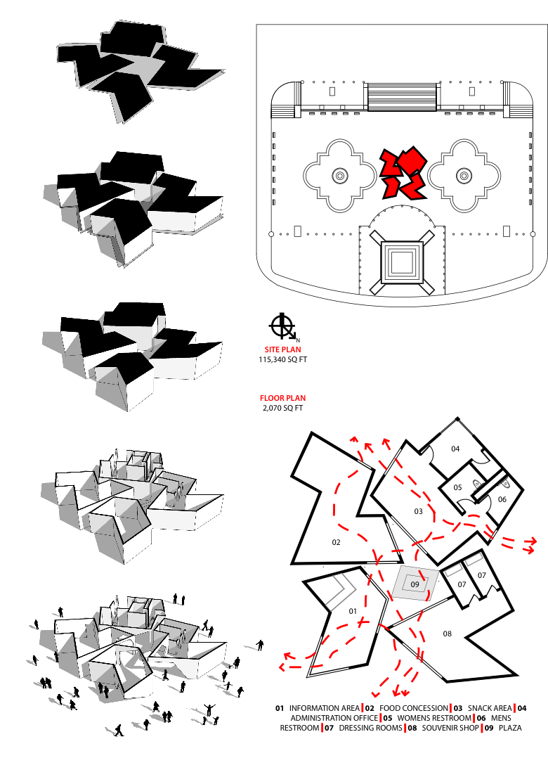 The placement is to make the flow of circulations move through out and interact with the pavilion. The cuts in its shape are defined by the pedestrian paths.