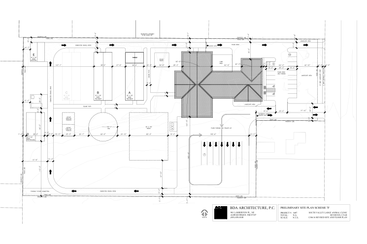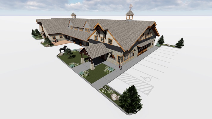 A freestanding equine veterinary hospital on an approximately 4.5 acre land parcel in Riverton, UT. The building is approx. ~11,500 sf and will provide 6 ICU Barns, 6 Med Barns, a large surgery room and observation deck, 4 standard exam rooms, a pharmacy, laundry room, doctors offices, and a large reception and waiting area. The client had requested the exterior be ranch/farm western style.