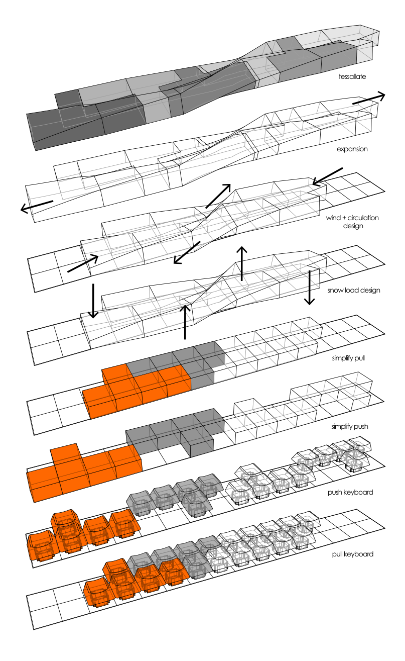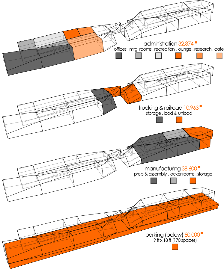 The concept and form of the building was derived from words which described the assembly plant and its functions.