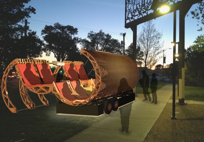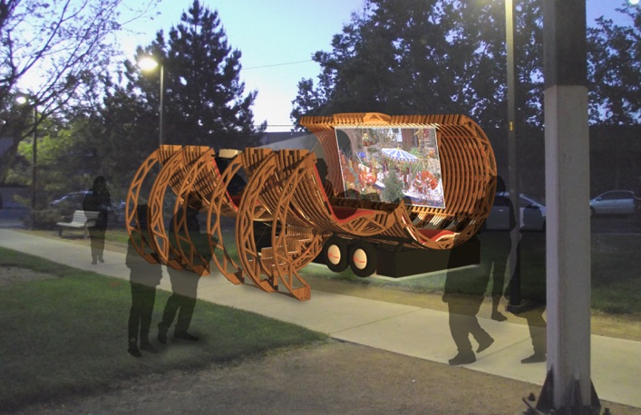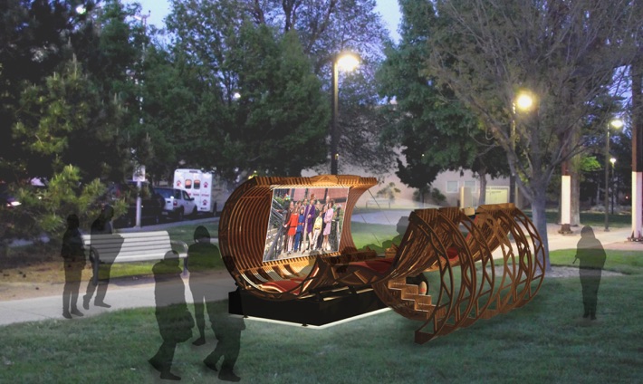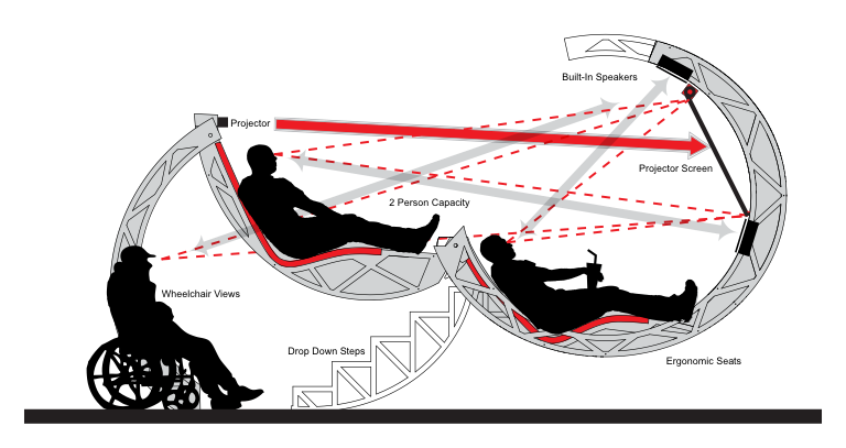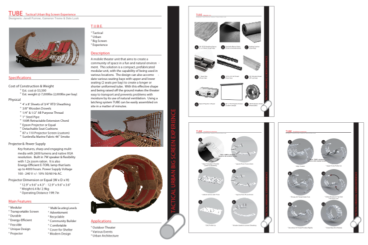 Deployable throughout the state of New Mexico, the T.U.B.E. provides an intimate sensory immersion. The T.U.B.E. will travel, by truck or semi, to a given location where it will detach from the vehicle. Then, through the process of unfolding T.U.B.E. will become a cinematic experience where the community can participate with varying levels of interaction. The most enveloping interaction will be climbing into the theater, sitting back into one of our ergonomic lounge seats, and viewing the projected film on a 5ft tall by 8ft 10in wide screen. Being at a close proximity to the action, with sub woofer assisted sound system, one will feel as though they are a part of the drama. The next level of experience will be pedestrian. Because the T.U.B.E. is not fully enclosed, passers by will view the film from adjacent pathways and become interested to the action unfolding the screen. This incidental involvement will spark interest in the general public who will then be able to go the T.U.B.E. application/website and get information about the project such as: where it will appear next, what will be showing, how they can vote on what will be shown, and how to get involved with both local cinema projects and use T.U.B.E. itself as an advertisement platform. Ultimately, our objective for T.U.B.E. is to bring awareness of small town theaters, sparking interest in revitalizing the many local cinematic gems throughout the state and the historic downtown neighborhoods that are connected to them.